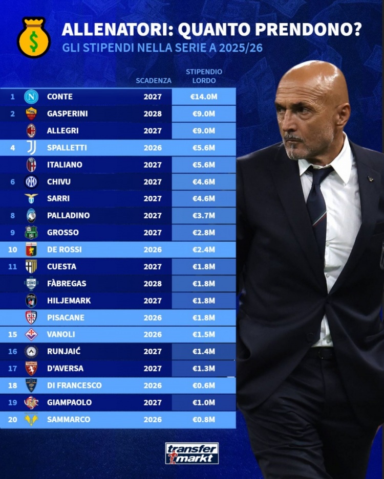 4月9日讯 德国转会市场盘点了意甲各队主教练的年薪情况,孔蒂以1400万欧元居首,加斯佩里尼和阿莱格里以900万欧元并列次席。